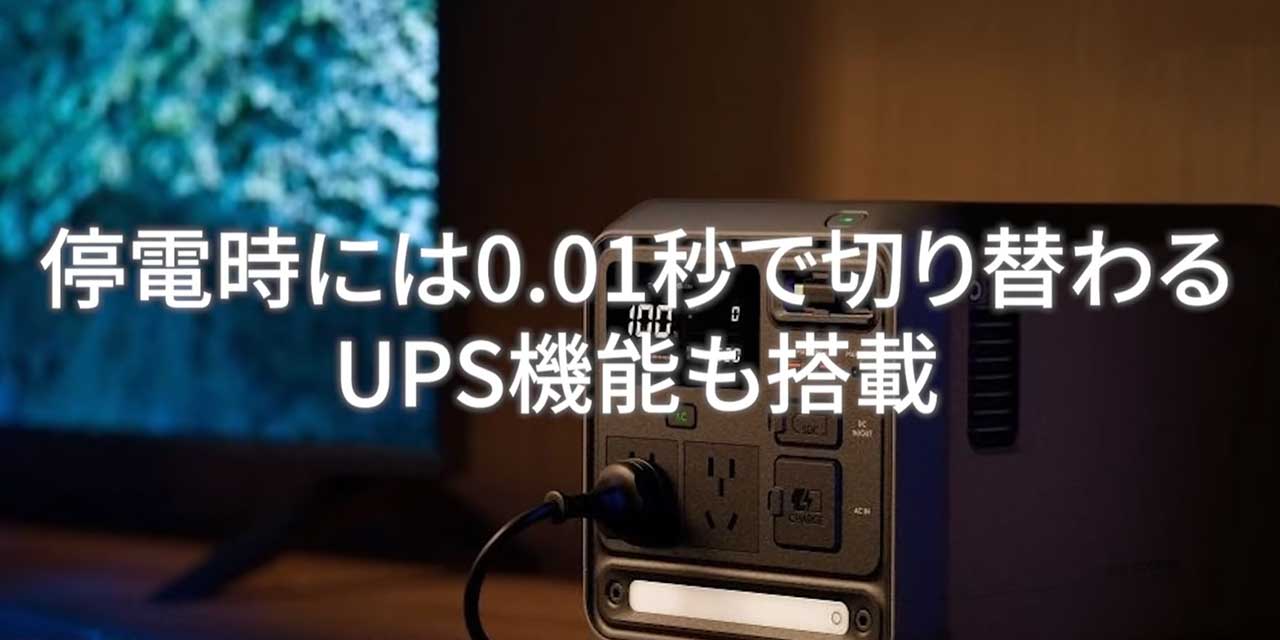 ポータブル電源は「いざという時のため」だけに押し入れにしまっておくのは非常にもったいないデバイスです。DJI Power 1000 Miniには、自宅のコンセントから給電している状態から停電が発生した際、わずか「0.01秒」で内蔵バッテリーからの給電に自動で切り替わる「UPS(無停電電源装置)機能」が搭載されています。
