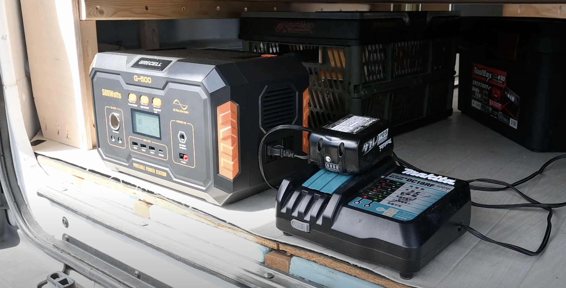 最後に触れられていたのが工具バッテリーの充電です。マキタなどのリチウムイオンバッテリーを、ポータブル電源から問題なく充電可能とのこと。DIY好きや大工仕事をする人にとって、これは大きなメリットです。キャンプや作業現場でも、工具を使いながら車中泊を楽しめる自由度が広がります。