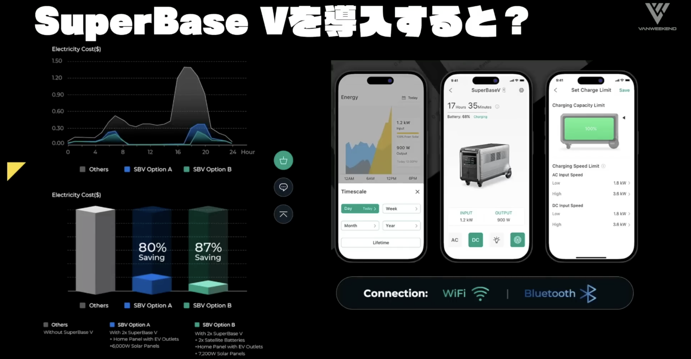SuperBase Vは持ち運び用途だけでなく、家庭用蓄電池としての利用を前提に設計されています。ホームパネルと接続し、日中はソーラーパネルで発電・蓄電、夜間や停電時にはその電力を家庭に供給。これにより、電気代最大80%削減が可能です。実際、筆者宅のように売電も行えば、毎月5,000円程度の収入が得られるケースもあります。